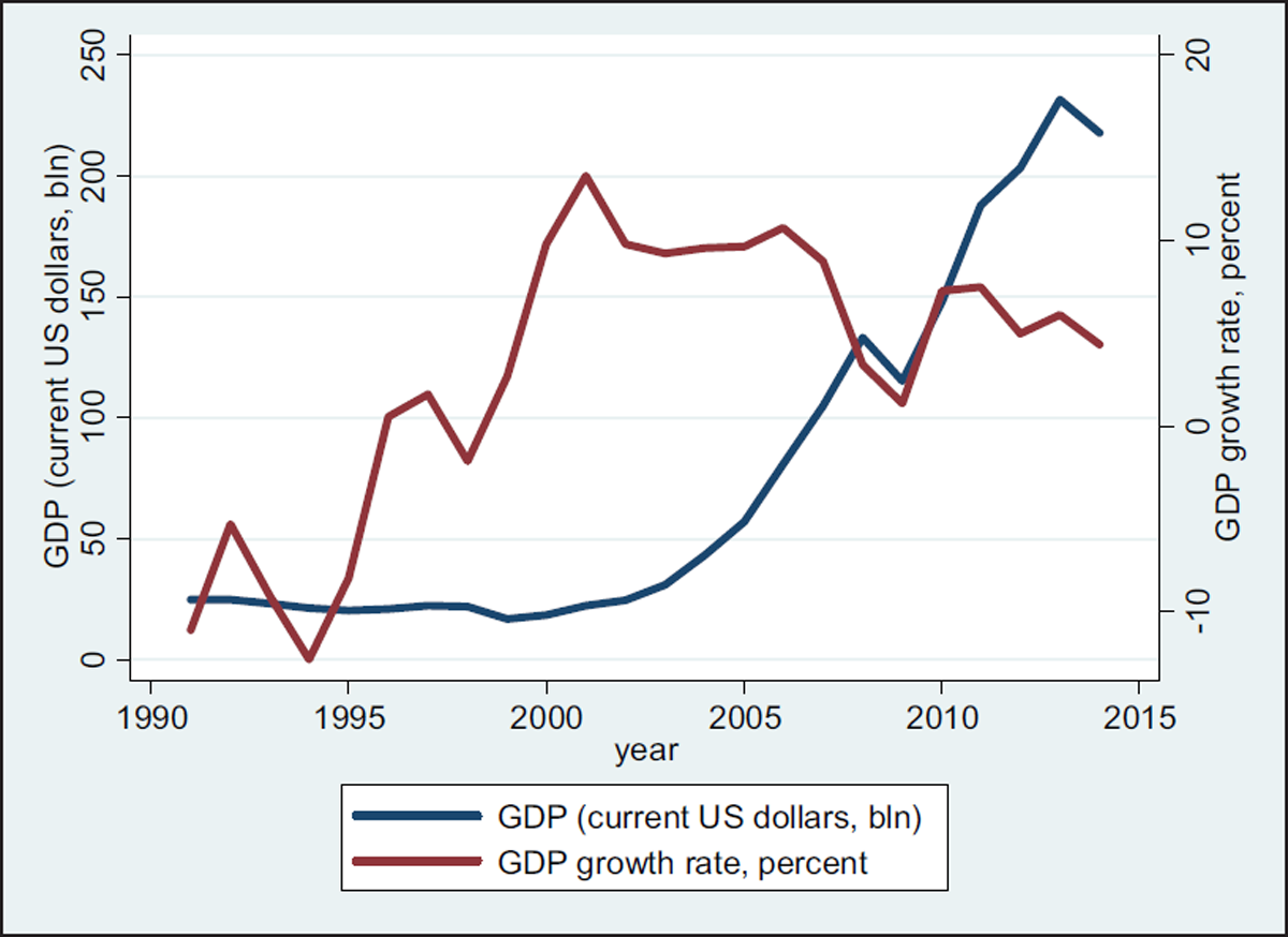 GDP and GDP growth of Kazakhstan in 1990–2014. Source: World Bank 2017.