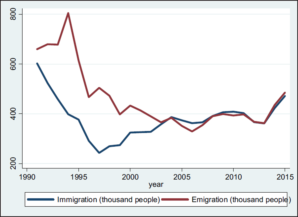 Immigration and emigration in Kazakhstan, 1990–2014. Source: National Statistical Agency of Kazakhstan (n.d.).