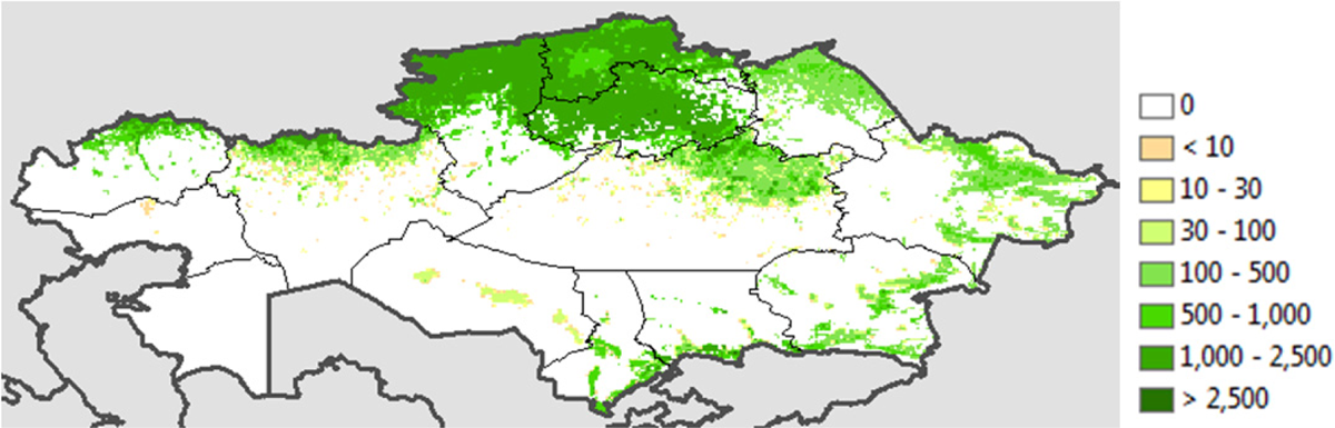 Wheat is mainly grown in three northern regions: Akmola, Kostanai, and North Kazakhstan (Figure 4). The total area under wheat is 12.4 million hectares (2006–2007). Out of these, 3.3 million hectares are in Akmola, 3.3 million in Kostanai, and 2.8 million in North Kazakhstan. The area used for wheat is mostly non-irrigated, with the irrigated area comprising less than 3 per cent of total wheat area. Land used for wheat production is also primarily unfertilized; fertilized land amounts to only 525,000 hectares.