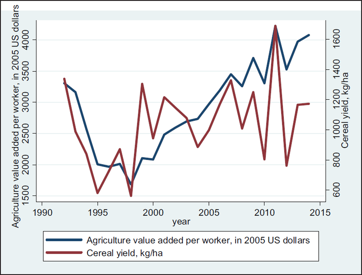 Yield and value added, 1990–2014. Source: National Statistical Agency of Kazakhstan (n.d.).