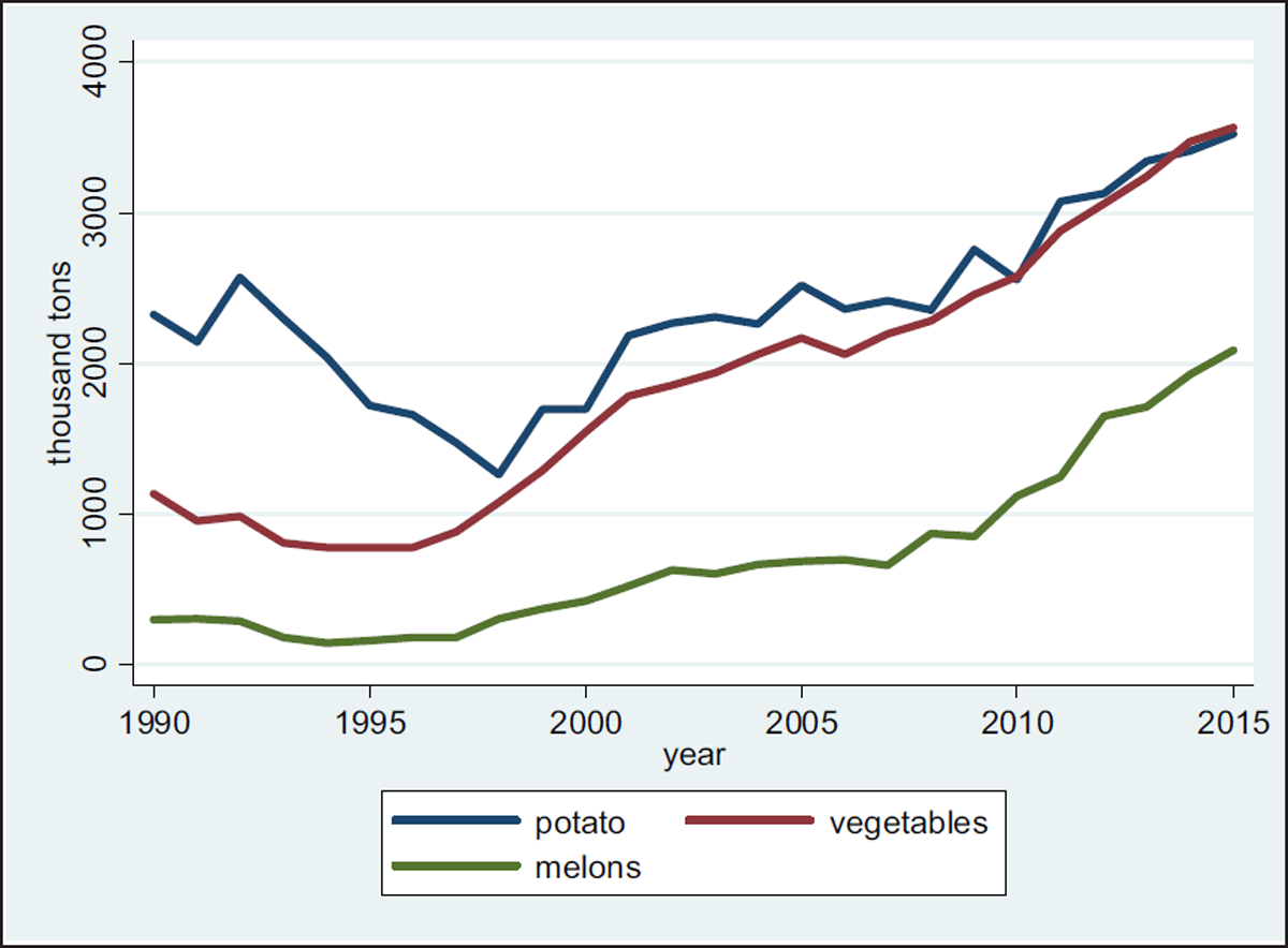 Unlike wheat and potatoes, melon and vegetable production declined only slightly during the early 1990s. However, this trend changed in the early 2000s, and the current output is significantly higher than during the early 1990s.