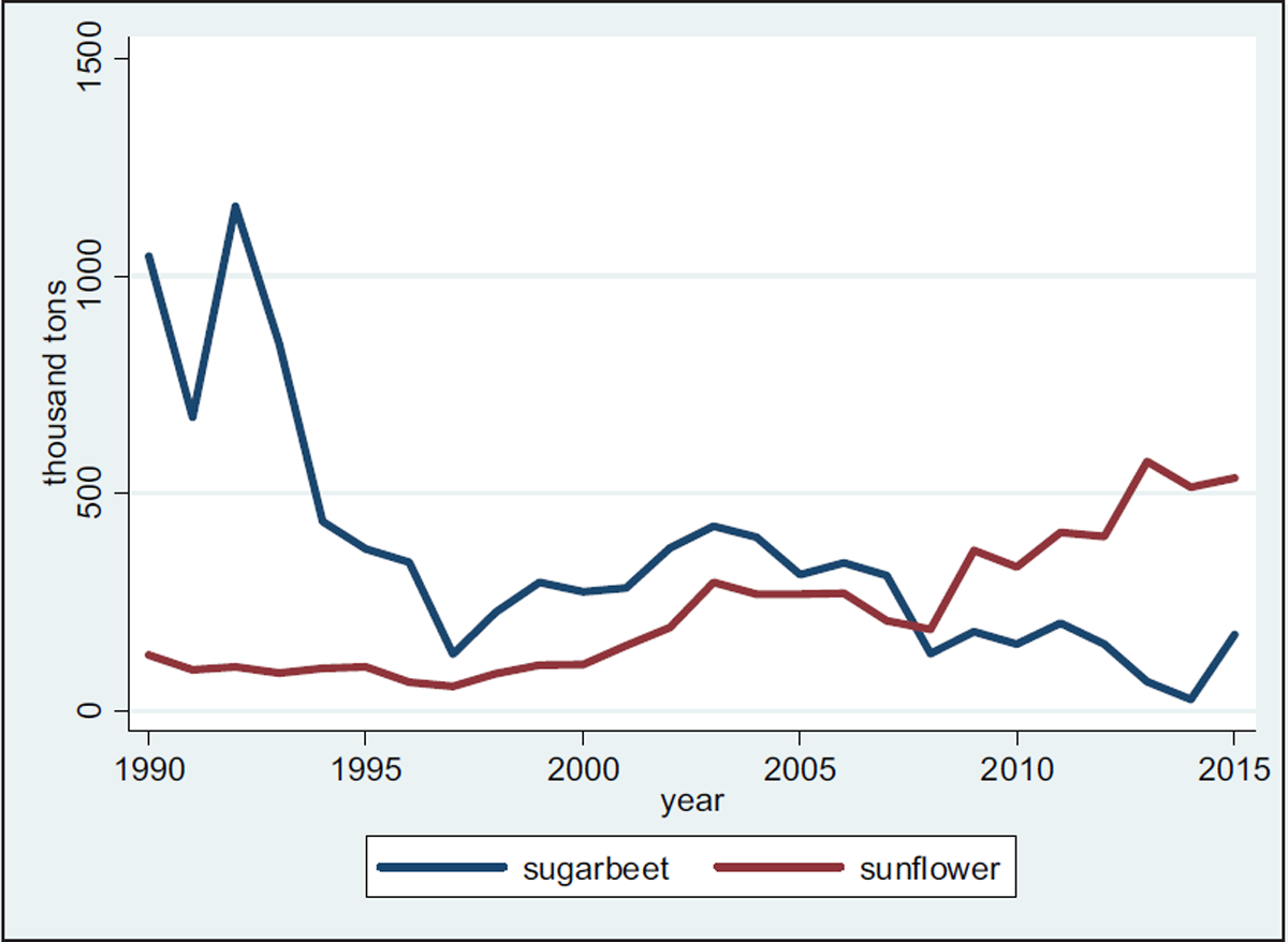 A different picture is observed for sugar beet and sunflowers. Sunflower production declined only marginally in the early 1990s. Since then, its production has been increasing (see Figure 9). The current output is six times larger than output in the early 1990s. Sugar beet production, on the other hand, dropped fourfold between 1990 and 2000.