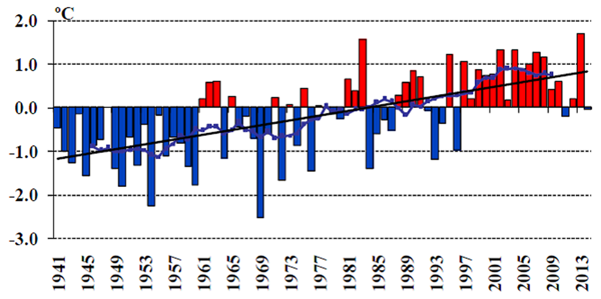 Ranking the warmest years in the world reveals that the 2000s have seen the warmest years, based on meteorological observations (Table 1). Kazakhstan is relatively typical in this respect (see Figure 10). Apart from the anomalously warm year of 1983, the climate has become warmer in Kazakhstan over the last two decades. Figure 10 also reveals the increasing trend in average temperature over the seventy-year period.