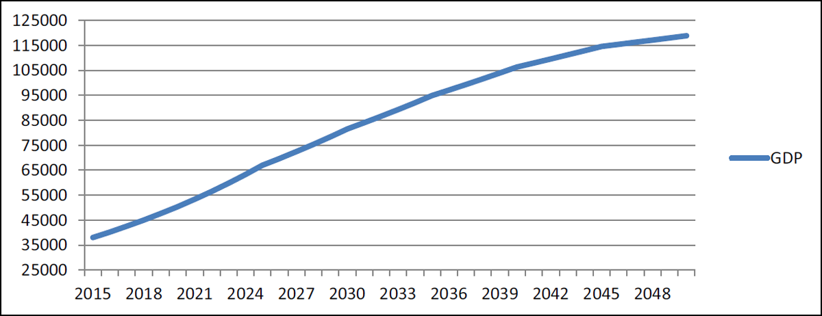 Economic development, defined by the growth of real GDP in tens of millions of USD, is presented in Figure 11. This is an OECD SSP2 average or middle of the road projection for the years 2015–2050. GDP per capita is not expected to grow with the same speed as GDP due to positive rates of population growth.