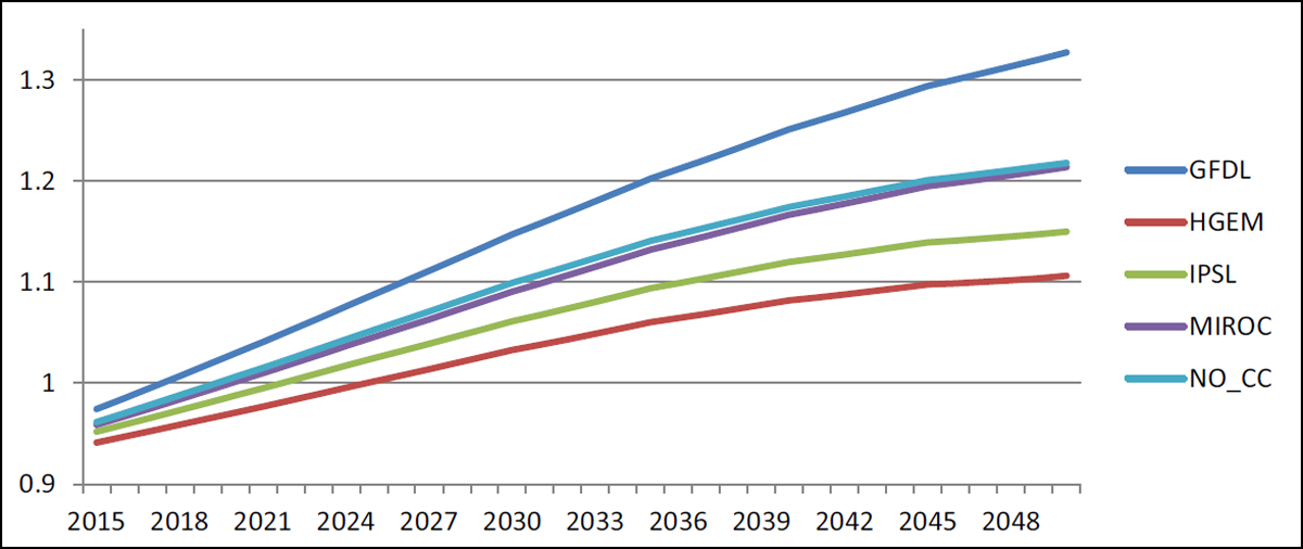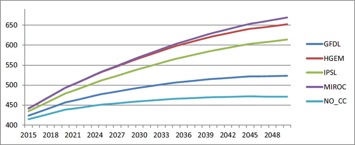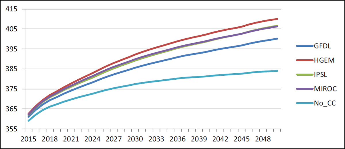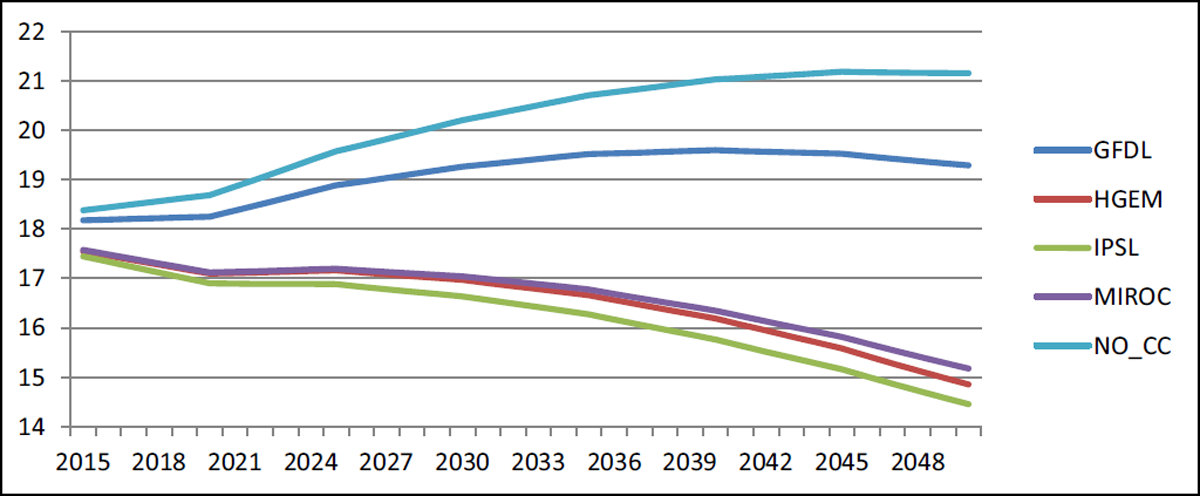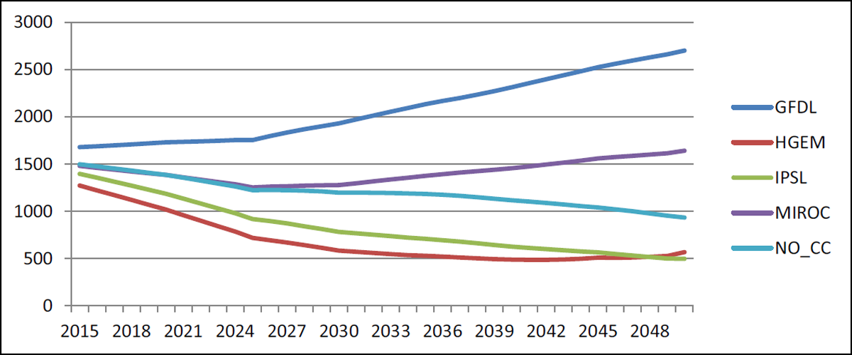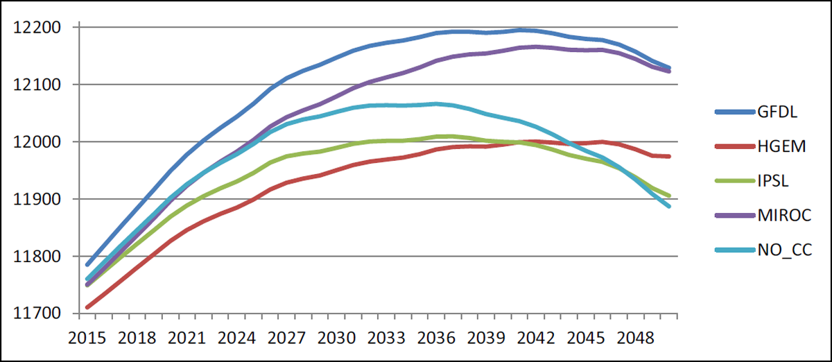In Figure 14, we note the changes in net exports. The results are derived from the difference between production and consumption, which, to a large extent, reflects differences in total production, which is driven by changes in both yield and cultivated area. Since GFDL had the highest yields and was essentially tied for the highest cultivated areas among the GCMs, it is no surprise that the highest net exports are found under the GFDL scenario. This also explains why MIROC is placed second for net exports. For the baseline, IPSL, and HGEM, net exports actually decline between 2015 and 2050, as a result of domestic production not rising as fast as domestic consumption.