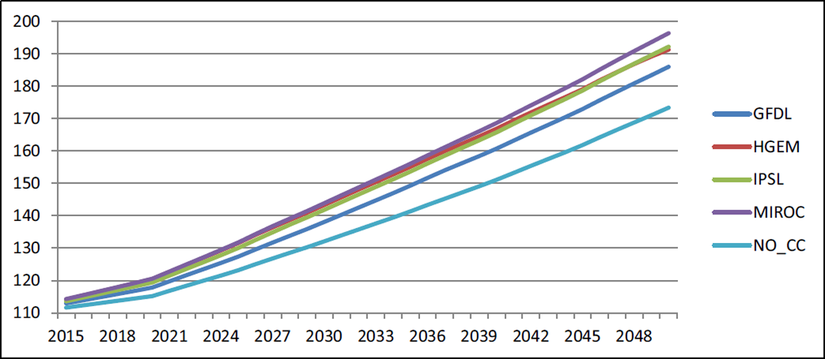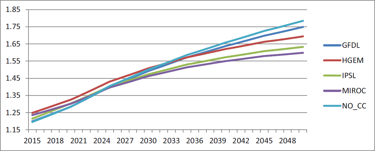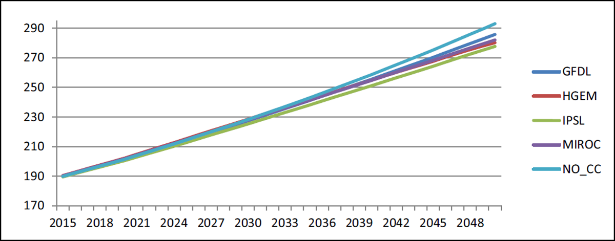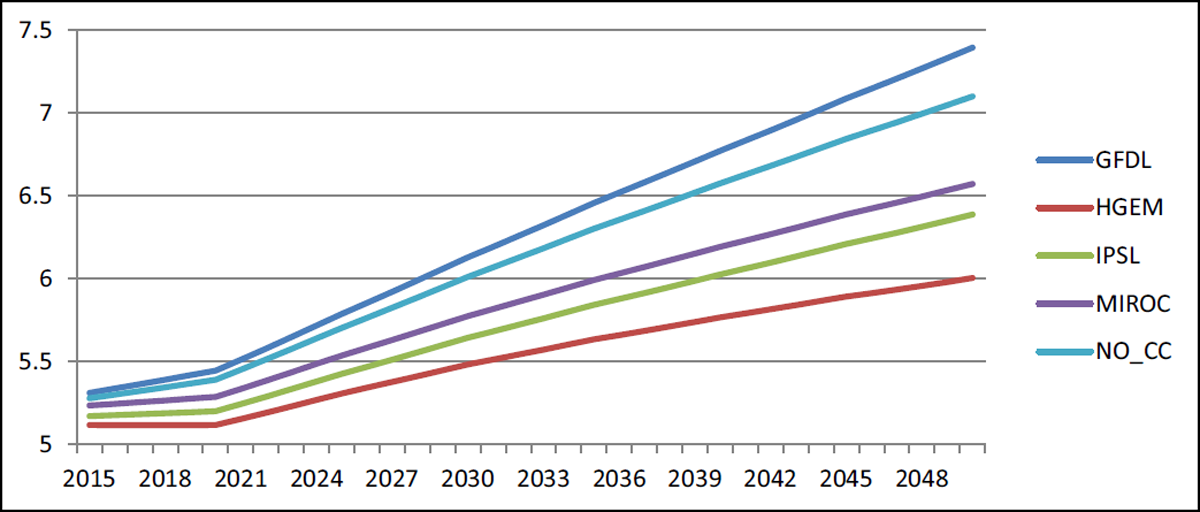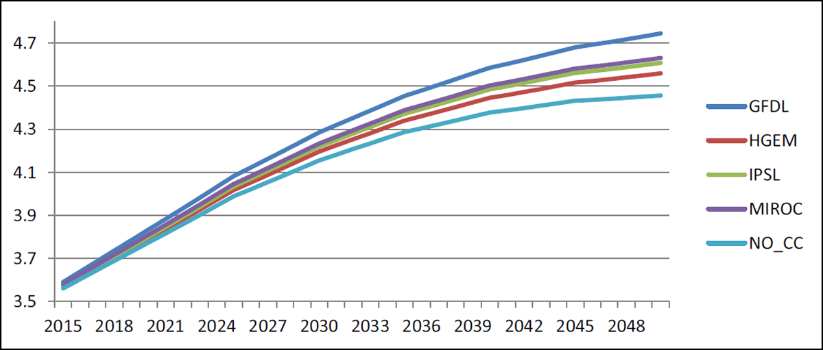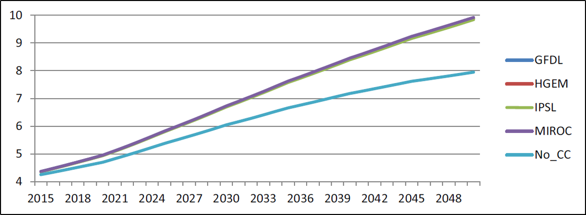 However, the advantage of higher rainfall is mitigated by the disadvantage of higher temperatures in the summer months when spring wheat is still maturing. In particular, GFDL, which has the lowest projected temperature increase, performs better than the baseline by 8.9 per cent in 2050. On the other hand, HGEM and IPSL perform worse than the baseline, with 9.3 per cent and 5.7 per cent lower yields by 2050, respectively. The performance of yields under the MIROC scenario is approximately the same as that of the baseline. In this case, the negative impact of higher temperatures is counterbalanced by the positive impact of more precipitation.